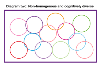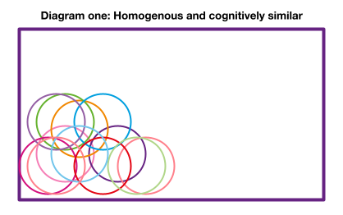 In the second diagram, the circles are spread more evenly and fill the space within the purple line, with no overlap. This represents a far less homogenous and more cognitively diverse group that can offer more to the organisation.