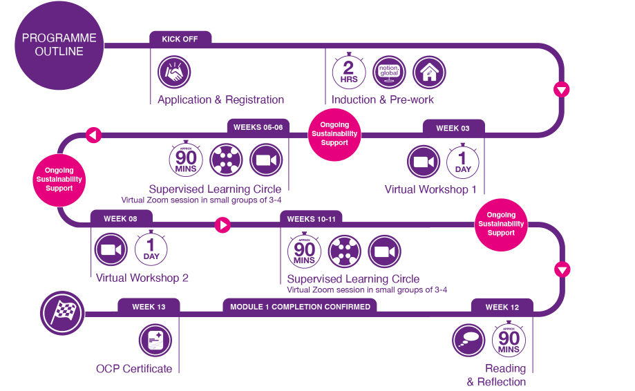 The journey begins with an email to you from the Client Success Team with your link to notion.global (our LMS) which includes all the programme info, programme background and information, workshop logistics and timings, pre-work and qualification information.